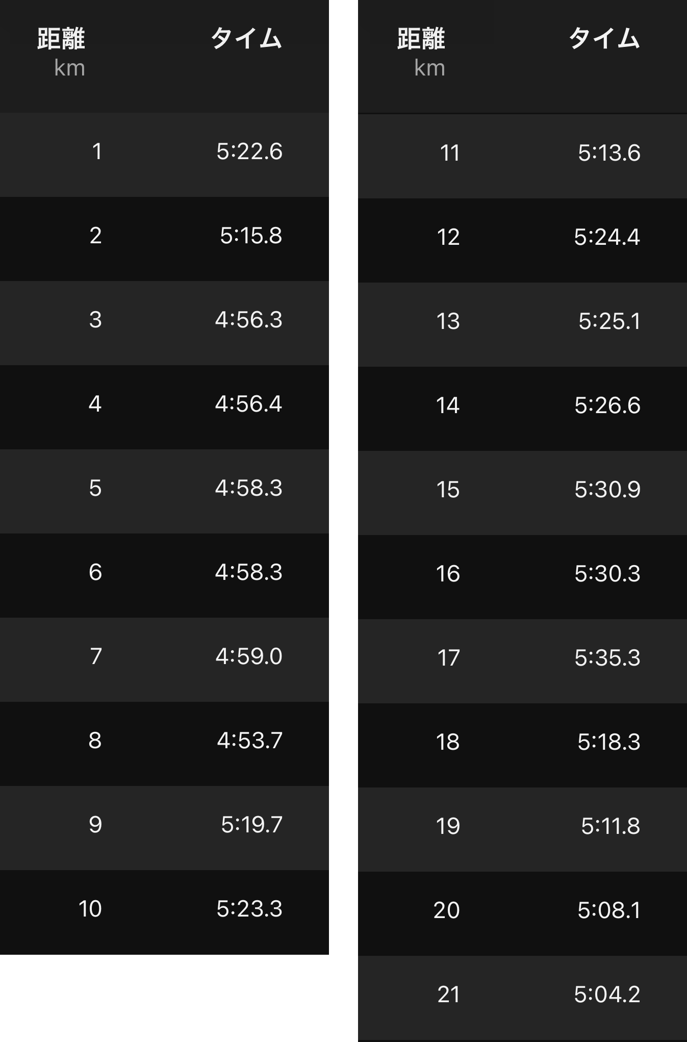 下りは5分キープ。登りは5分30秒キープで出来ました。8kmまでは下り。17kmまでは登り。残り2kmは平坦かな5分キープ。