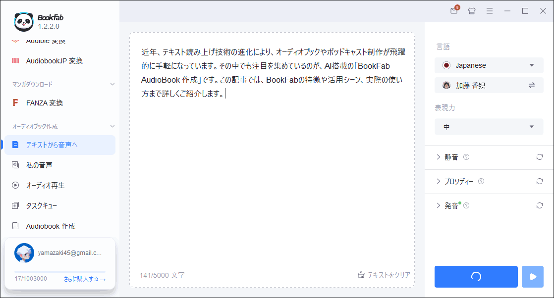 変換系は3冊まで無料で試せます。「BookFab AudioBook 作成」の無料プランでは、読み上げ可能な文字数が3,000文字までです。なぜか改行も1文字です。句読点も1文字です。