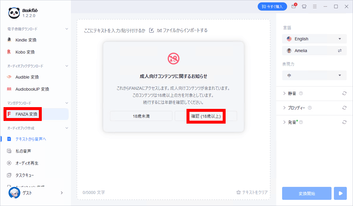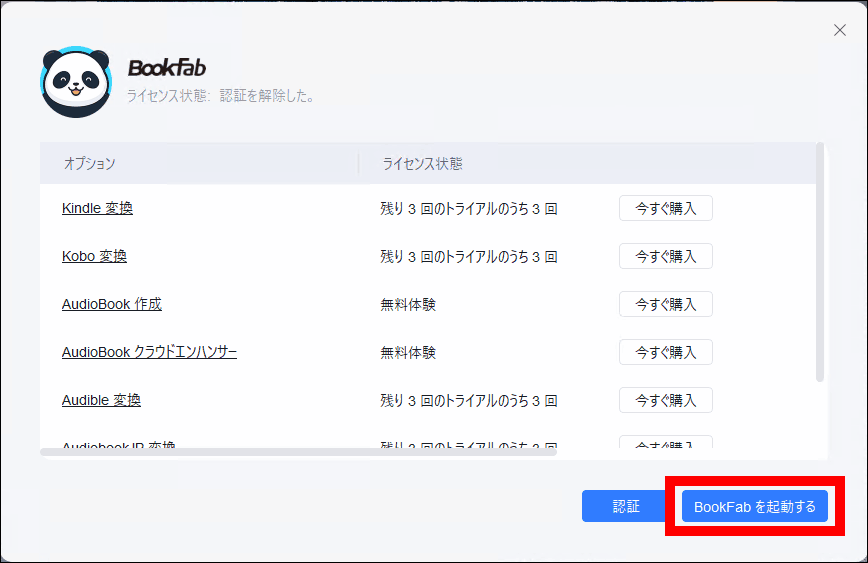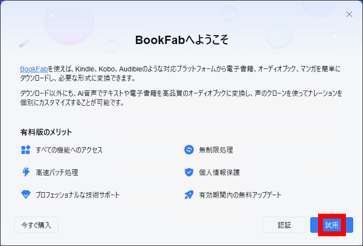 BookFabは、ライセンスを購入していなくても「無料体験版」として動作します。
