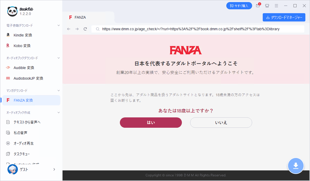 BookFabは、ソフトの中に「専用ブラウザ」が内蔵されているイメージです。ここでは「はい」で進めてDMMアカウントでログインしてください。