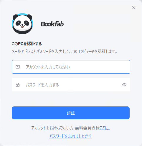 BookFab用のID・パスワードを入力することで利用できます。お持ちでない場合は、「ここに」をクリックして登録してください。