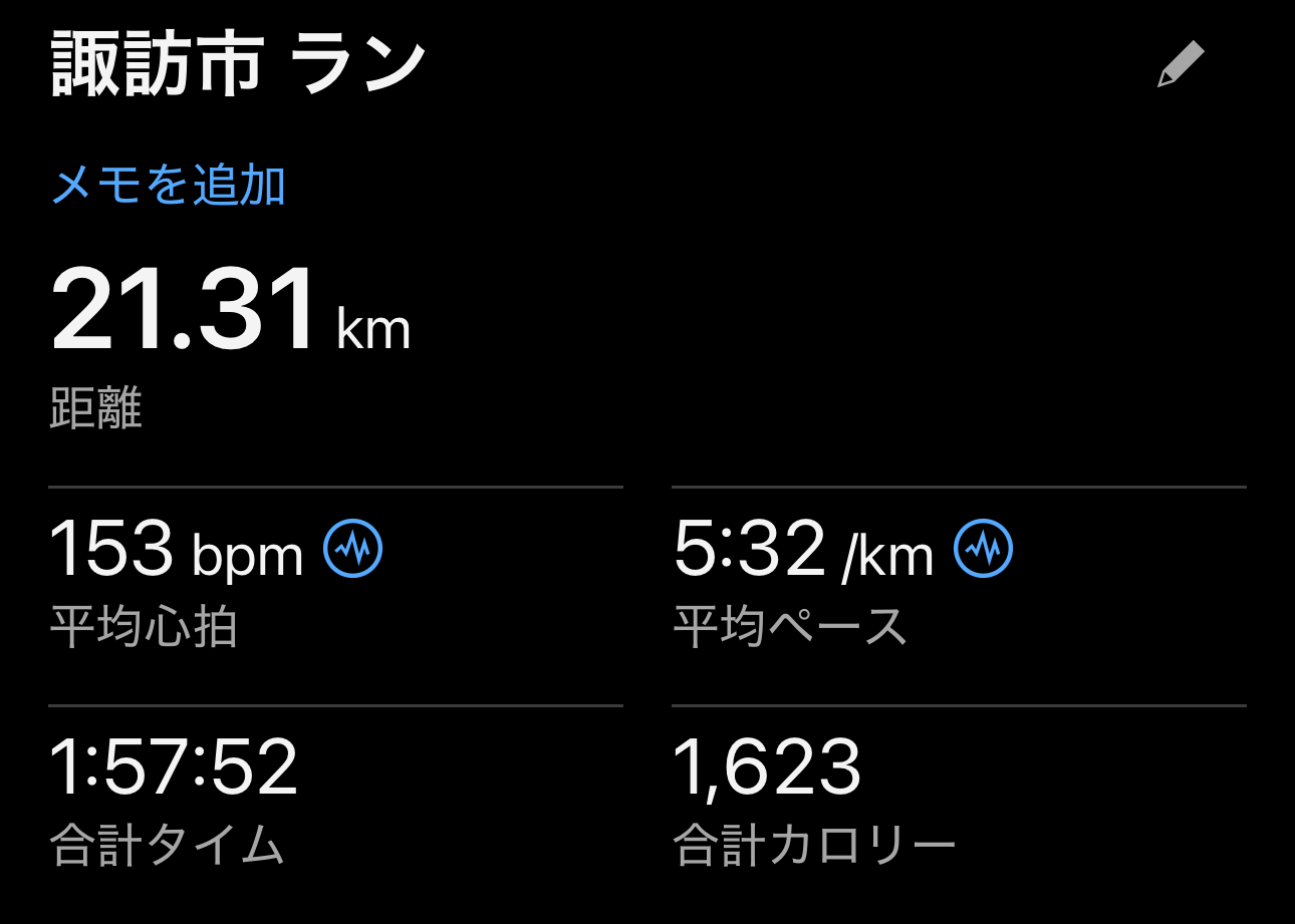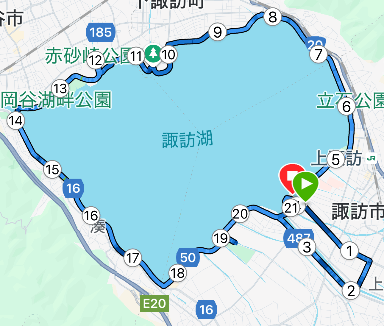 諏訪湖16kmを一周できるのが魅了です。ただ、ハーフマラソンだと距離が足りないのでスタート地点で迂回しています。