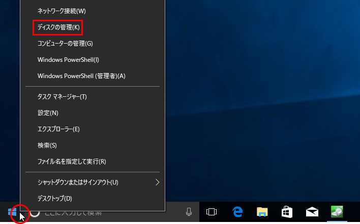 Windowsマークを右クリックします。もしくは[Windows]+[X]でも同等の操作ができます。